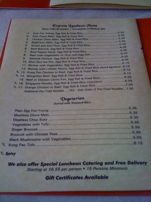Egg rolls, sweet and sour chicken, Mongolian beef (spicy), special chicken kow (spicy) and steamed or fried rice.
